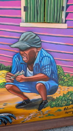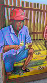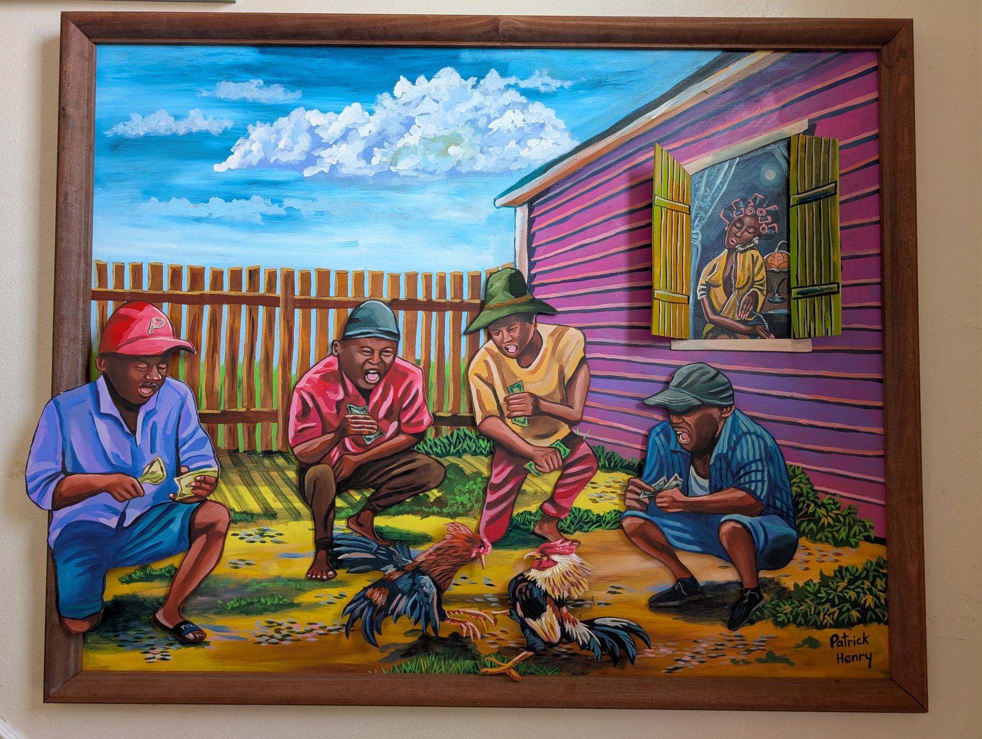 This piece feels like a backyard theater where everyday life steps into the spotlight and performs with bold color and rhythm. Four men gather in a sunlit yard, their attention locked on two roosters in a moment of high-energy rivalry. Rather than glorifying conflict, the scene reads like a snapshot of intensity and tradition, where competition, storytelling, and community all blend into one lively exchange.