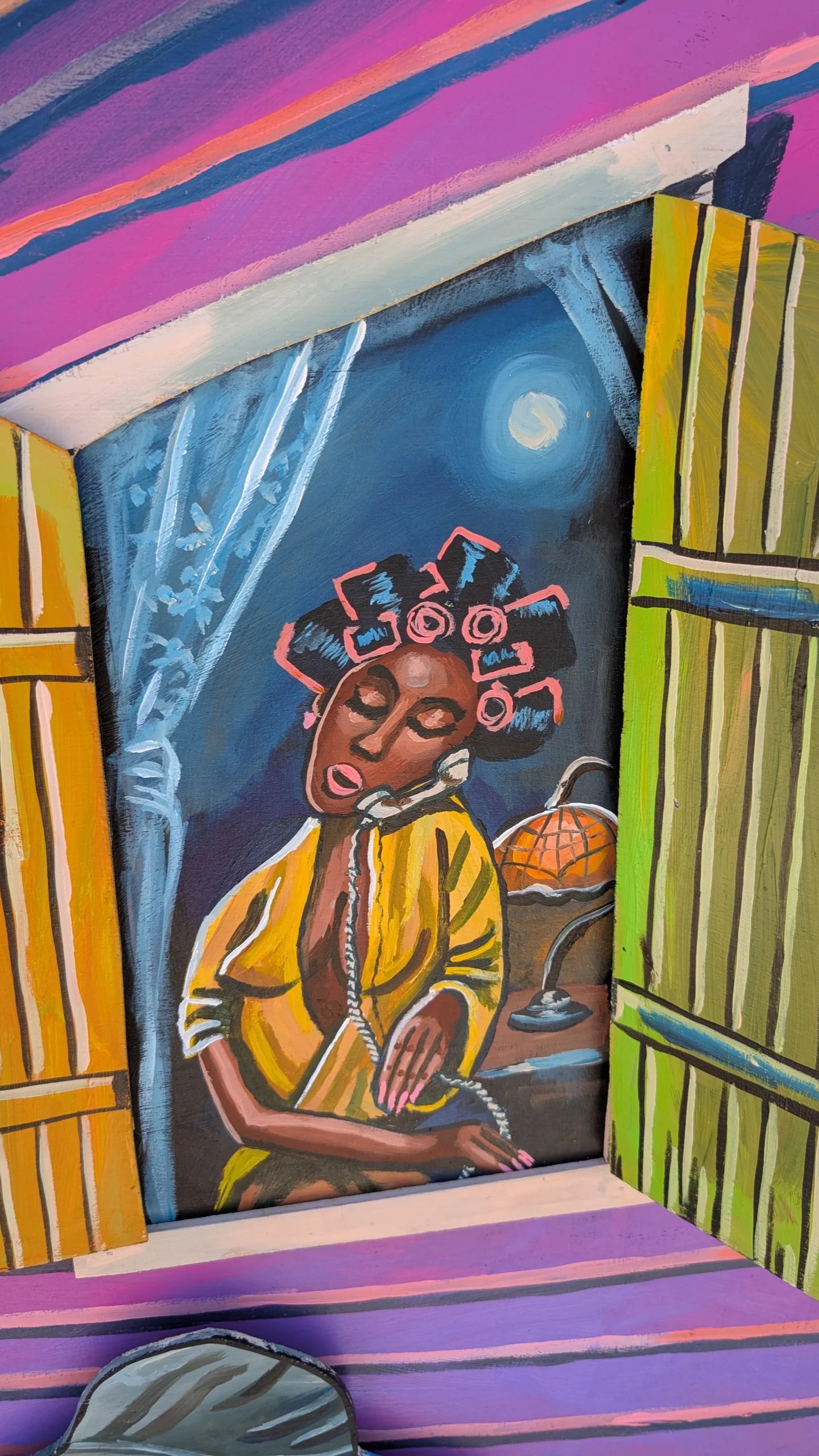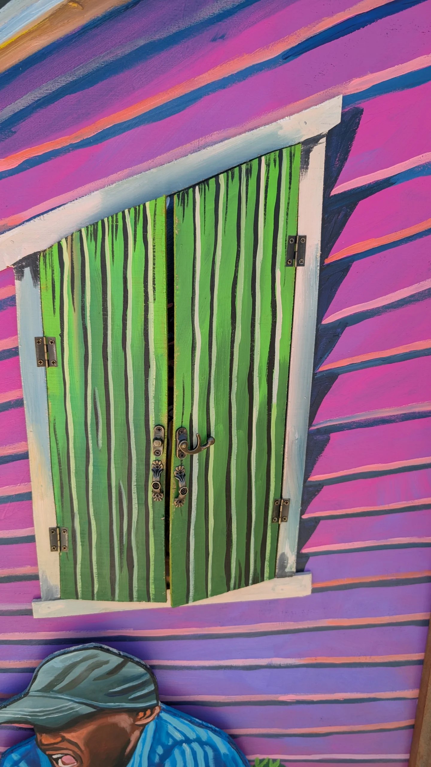 Behind them, the house bursts with personality, striped in vibrant pinks and purples, it stands like a character itself. In the window, a woman looks on, her presence adding another layer to the story, (🤣 probably calling the cops) like a quiet narrator observing the scene from just outside the frame. The open shutters feel like curtains pulled back on a stage.