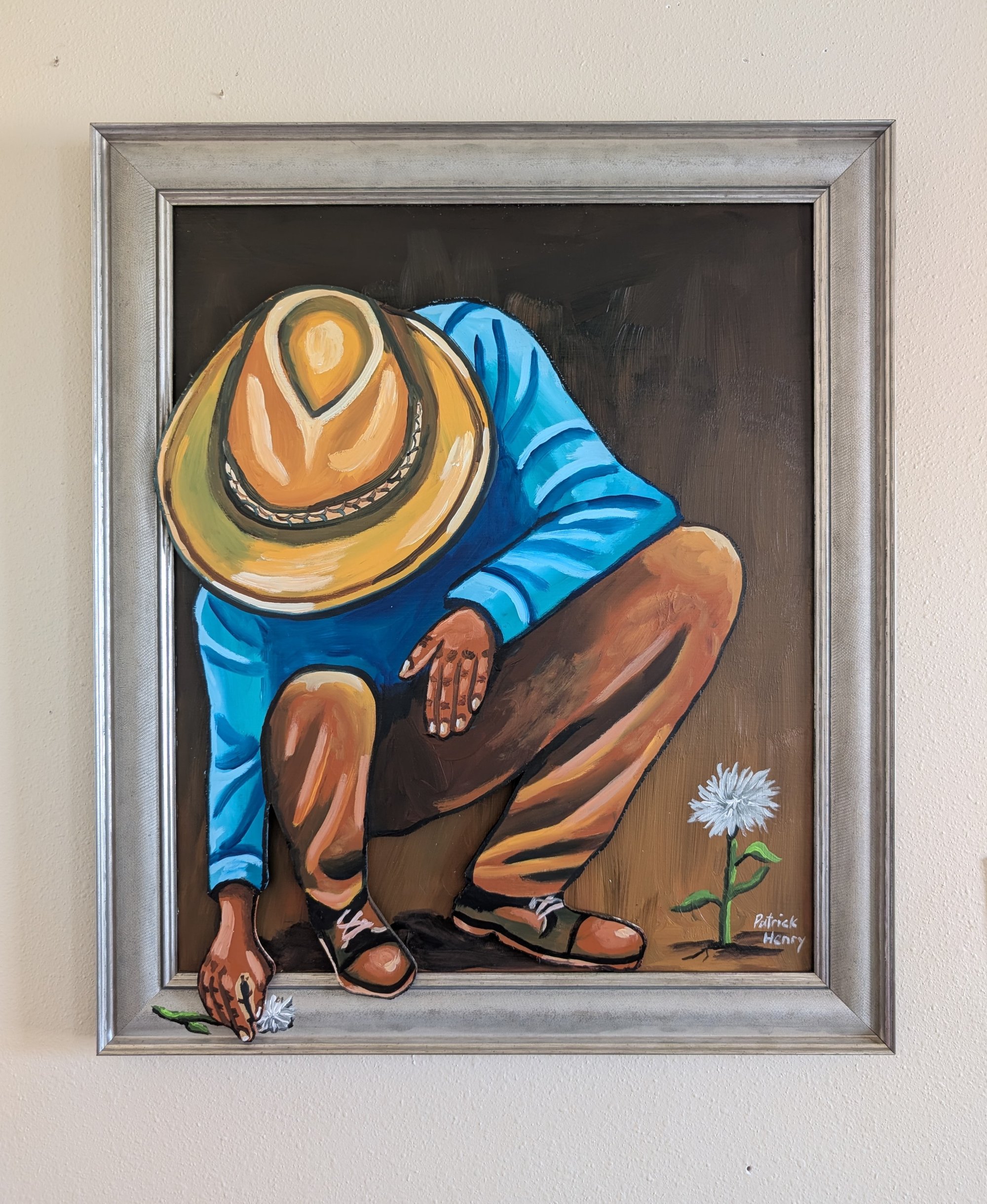 At the center, a figure crouches low, almost folding into himself, his wide-brimmed straw hat shielding his face from view. That hidden identity makes him feel universal, like he could be anyone who has ever paused to reflect, to work, or to reconnect with something simple and real. His bright blue shirt hums against the otherwise warm, grounded palette, pulling your eye in like a steady heartbeat beneath the surface.